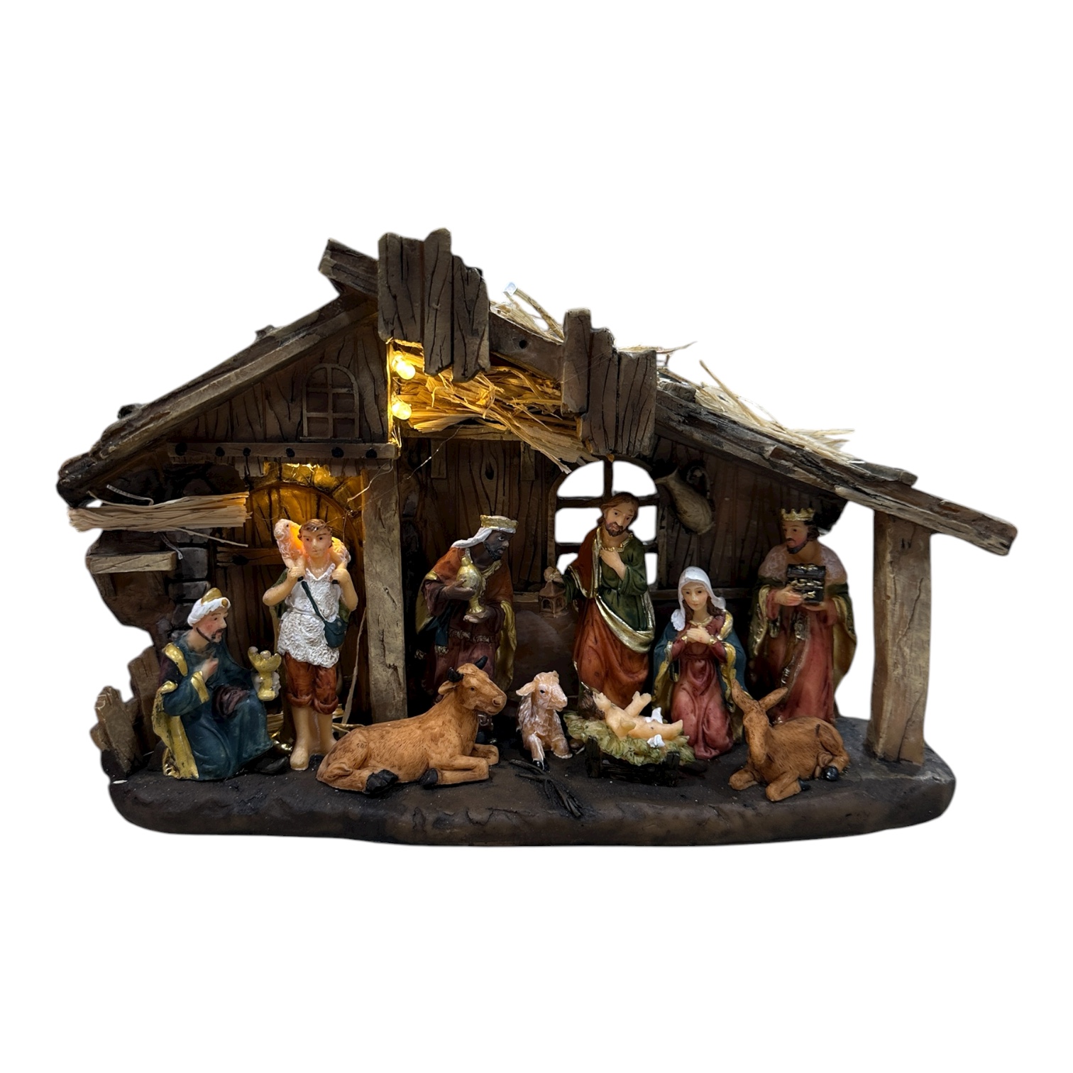 Pesebre fabricado en resina con luz. Diseño sagrada familia