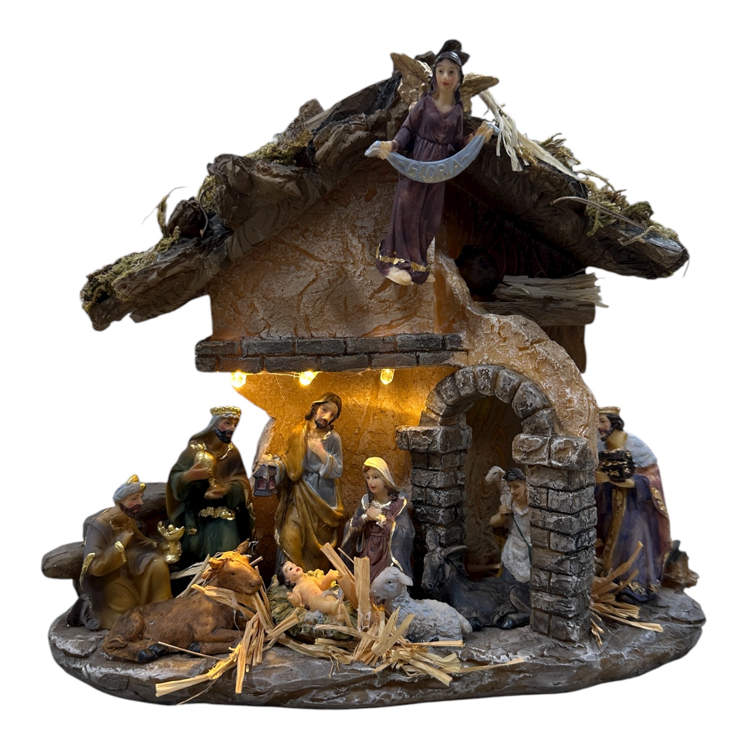 Pesebre fabricado en polirrecina con luz. Diseño sagrada familia con animales y un ángel